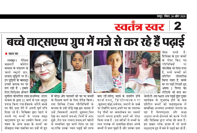 *वाट्सएप्प ग्रुप में ऑनलाइन पढ़ाई-वर्तमान में एक माह से मैं बच्चो ले साथ वाटसअप ग्रुप में जुड़ कर मनोरंजनात्मक तरीके से पढ़ाई लिखाई में जुड़ी हूँ,तथा ग्रुप से ही बच्चों एवम पालक को कोरोना वायरस के प्रति जागरूक कर रही हूँ।